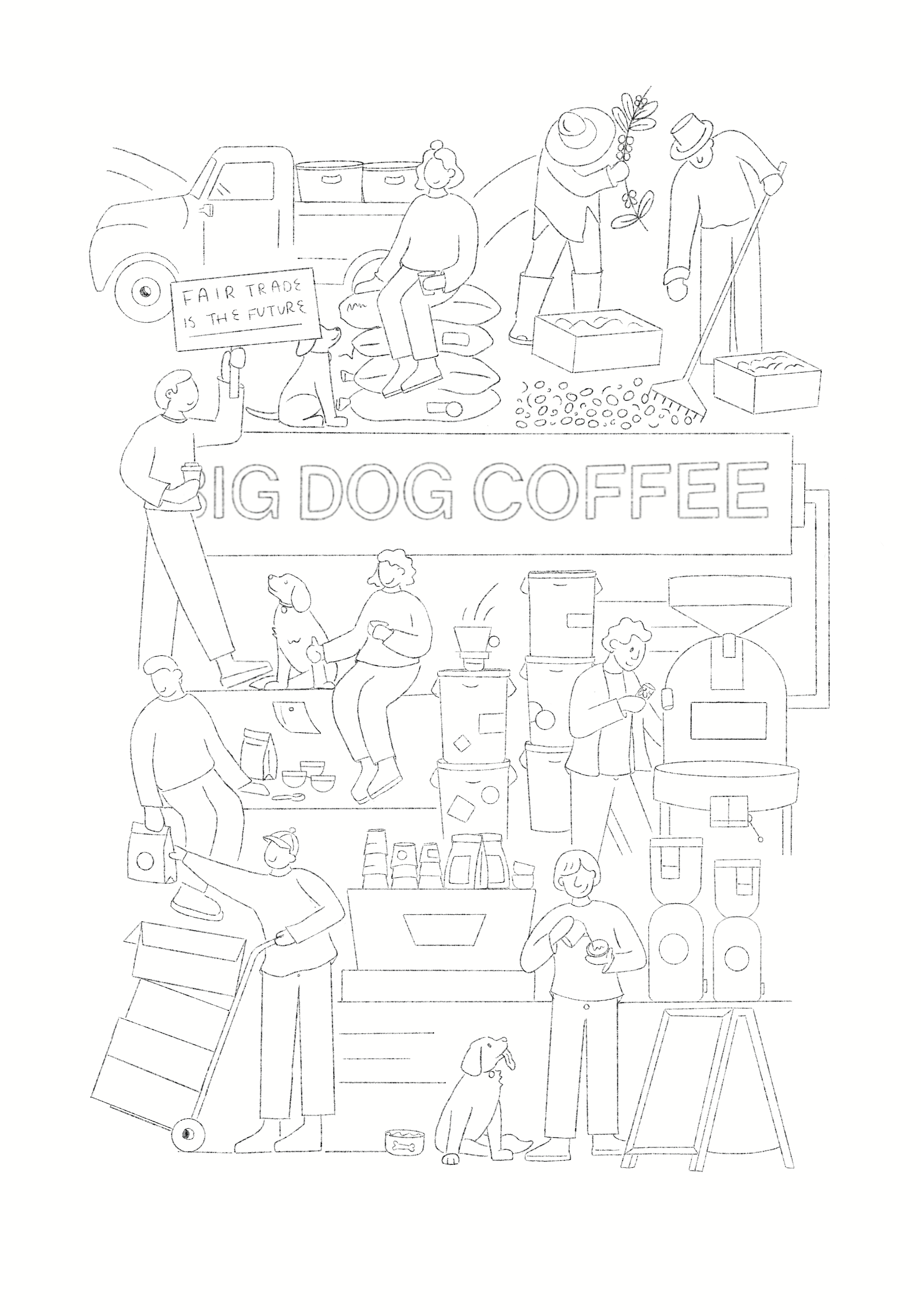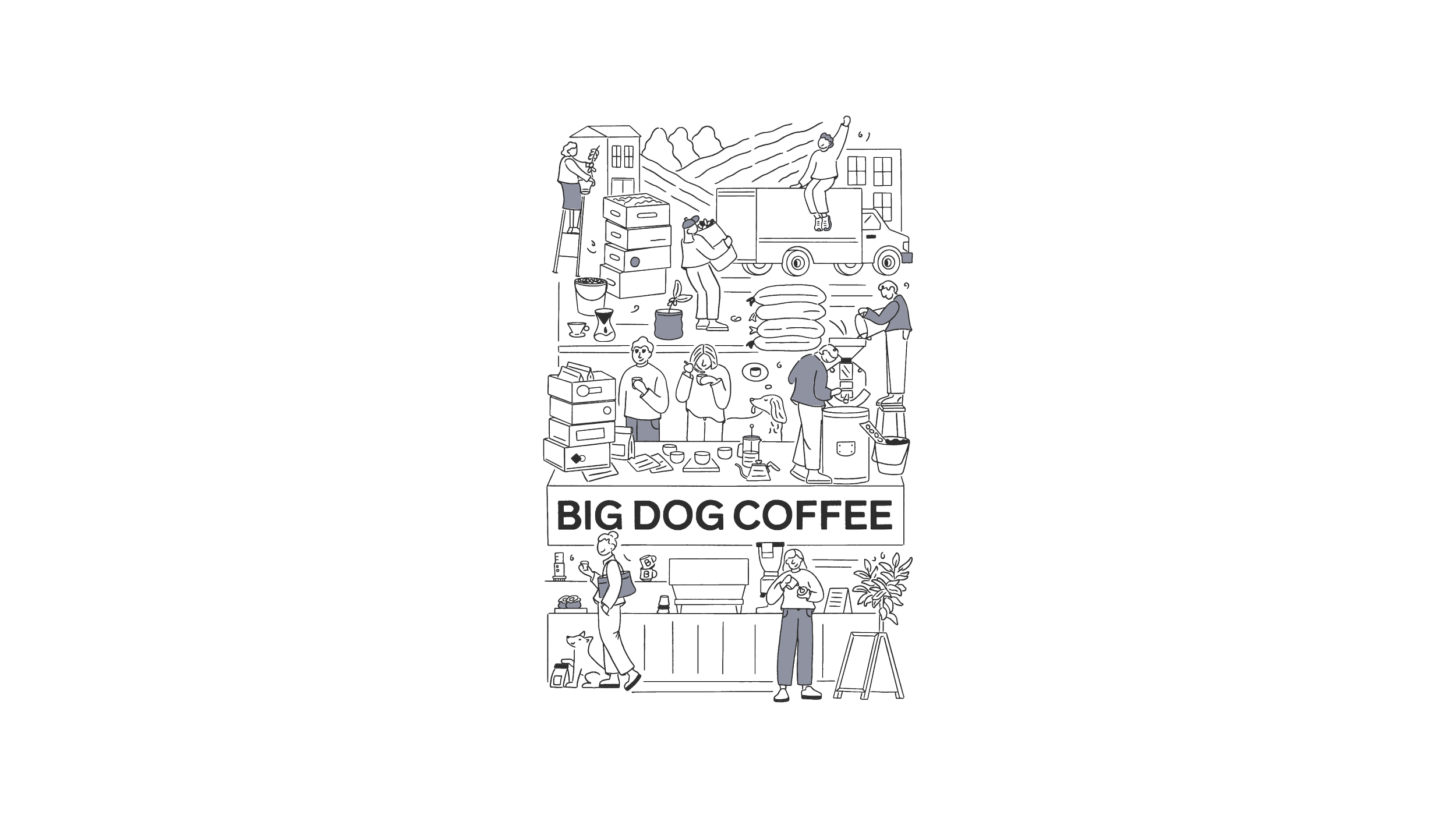 The first illustration zoomed out from the day to day of the business to capture the big picture of Big Dog Coffee.